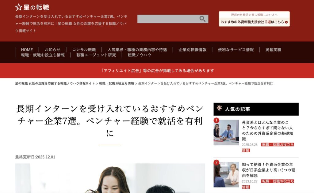 このたび、株式会社Synergy Careerが「星の転職」にて、長期インターンを受け入れているおすすめベンチャー企業7選として掲載されました。