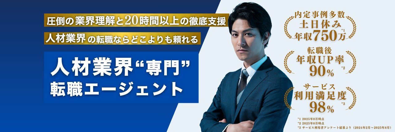 ひとキャリは、人材業界・HR業界に特化した転職エージェントです。平均20時間以上の手厚いサポートと年収アップ率90%以上の実績を誇ります。人材業界への転職を考えている方はぜひ利用してみてください。